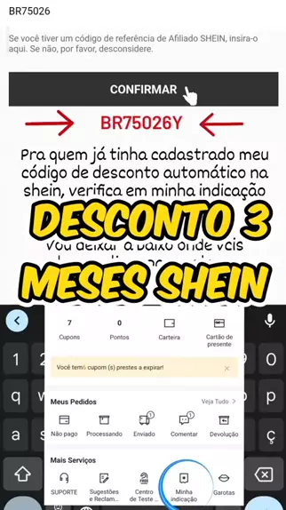 adicione o código BR75026Y em "minha indicação " no app SHEIN e ganhe 10,00 desconto em todas as compras podem ser usados com outro cupom 🫶🏻