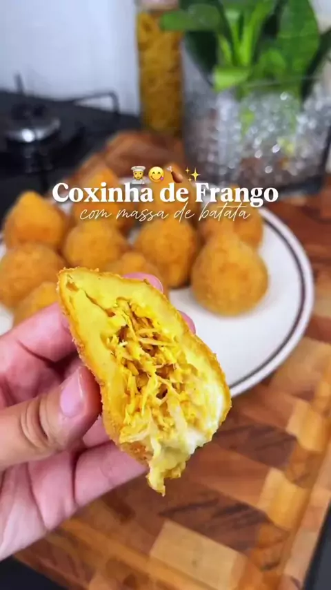 Coxinha de frango com massa de batata 😋❤️ Ingredientes: 2 batatas médias cozidas 1 colher de sopa de manteiga Meia colher de sopa de sal 1 sachê de sazon 500 ml de leite Quando começar levantar fervura adicione 2 xícaras de farinha de trigo #receitas #Salgado #lanches #coxinha #foryou
