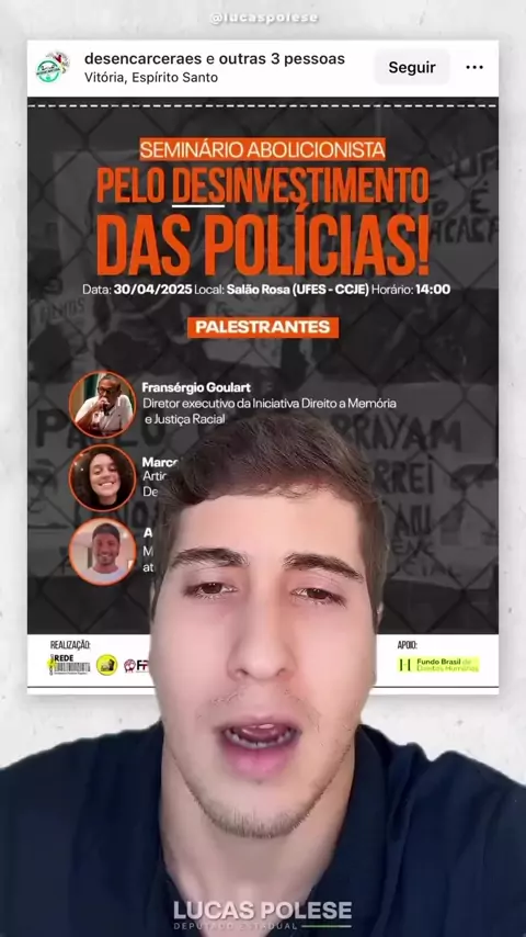EVENTO NA UFES PEDE CORTE DE VERBA DA PM E ATÉ RETIRADA DE COLETES DOS POLICIAIS. Nesta semana, a Ufes lançou o seminário "Pelo Desinvestimento nas Polícias", onde foram defendidas propostas de altíssima relevância para a sociedade, como parar de comprar coletes à prova de balas para a PM, reduzir o investimento nas forças de segurança, destruir áreas do agro e invadir indústrias de fertilizantes.