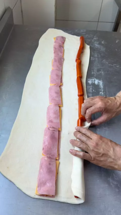 👨‍🍳 Receita da massa 500 g farinha de trigo 50 g açúcar 10 g sal 10 g fermento biológico 50 g margarina 1 ovo Água ao ponto (≈ 240 ml) 🥐 Presunto e queijo que derrete e conquista no primeiro mordida 😋 #salgados #presuntoequeijo #receitasfaceis #kawaiiFood #massadesalgado
