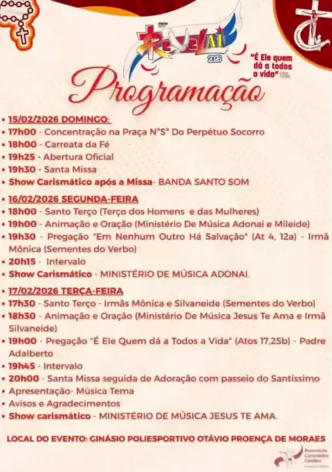 É claro que não poderia faltar, esse convite mais que especial vindo de nosso Pároco da Paróquia de Santo Antônio, Padre Antônio.😇🕊️🔥 É Ele Quem Dá A Todos À Vida"❤️‍🩹 *Participe do REVELAI 2026!* 🗓️Data: 15,16 e 17 de fevereiro 📍Local: Ginásio Poliesportivo Otávio Proença de Moraes