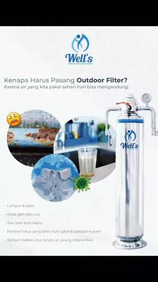 Filter Air Well's Outdoor Saringan Air Bersih & Jernih. Di desain untuk menyaring partikel kasar & zat berbahaya dari air keran di rumahmu, biar kamu bisa pakai air setiap hari dengan tenang tanpa adanya rasa khawatir. Jangan tunggu sampai air yang " keliatan bersih" malah jadi sumber masalah. Investasi kecil hari ini, untuk perlindungan besar besok. Well's Outdoor Filter yang menyaring sumber air sebelum masuk kerumah sehingga air yang tersaring menjadi Air bersih & aman 082283389199