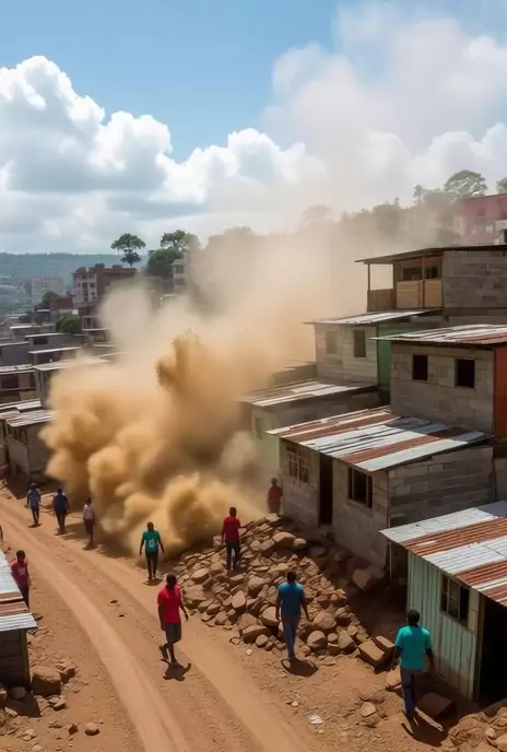 Extensa cena de deslizamento em favela construída na encosta: lama e rochas engolem becos e varandas, casas de madeira e blocos desabam umas sobre as outras, nuvem de poeira densa sobe cobrindo o sol; câmera drone começa alto (establishing) e desce em helicóptero para um tracking shot lateral enquanto a massa avança; close-ups em portas e janelas explodindo, mão de um morador segurando uma criança (sem mostrar ferimentos), moradores tentando puxar vizinhos, trilha sonora tensa, sound design com