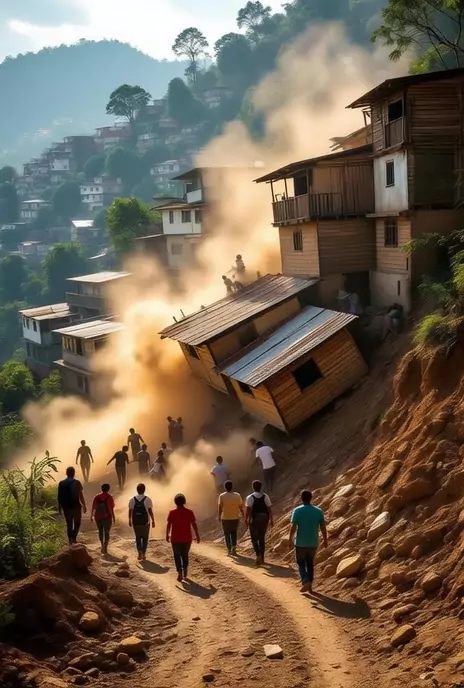 Favela em encosta sofre um deslizamento de terra; casas de madeira e alvenaria deslizam e colidem, telhados desabando sobre outras casas, poeira, destroços voando, moradores correndo e ajudando uns aos outros; tomada vertical 9:16, plano médio para amplo, câmera em movimento para cima (tracking up) seguindo a massa de terra, film look cinematográfico 4K, 24fps, motion blur sutil, luz dourada de fim de tarde filtrada por poeira, som intenso de terra e madeira quebrando + gritos distantes, sensaçã