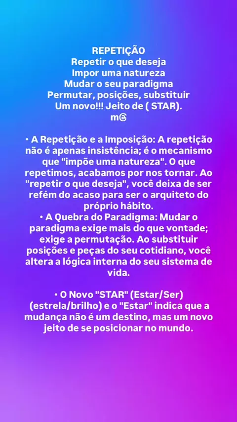 #Repetição Repetir o que deseja Impor uma natureza Mudar o seu paradigma Permutar, posições, substituir Um novo!!! Jeito de ( STAR). m@ • A Repetição e a Imposição: A repetição não é apenas insistência; é o mecanismo que "impõe uma natureza". O que repetimos, acabamos por nos tornar. Ao "repetir o que deseja", você deixa de ser refém do acaso para ser o arquiteto do próprio hábito. • A Quebra do Paradigma: Mudar o paradigma exige mais do que vontade; exige a permutação. Ao substituir posiç