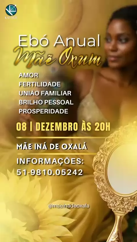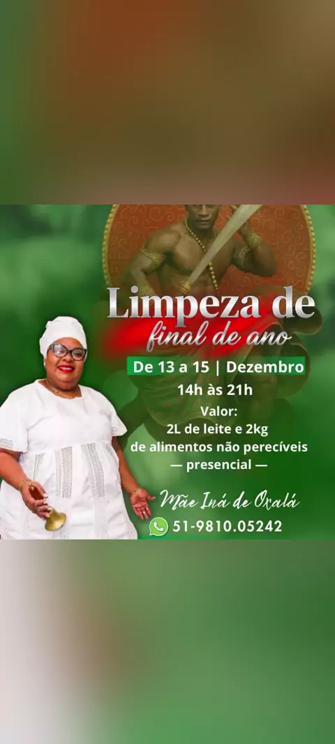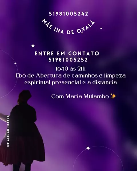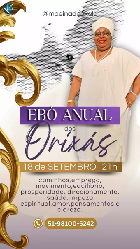 Bom dia!! Algo especial está no ar!! Dia 18 de Setembro será realizado nosso Ebó anual aos Orixás. Onde iremos reverenciar os Orixás de Bará a Oxalá, rogando força e renovando nossas energias, fazendo com que nossa ligação torne- se mais forte junto ao sagrado .. E Mãe Iná de Oxalá quer dividir com você essa energia,venha participar, venha buscar melhoras em seus caminhos, em sua vida!! Quer mais informações, nos chame!! 51981005242 Mãe Iná De Oxalá 🕊️🤍 #fé #foryou #fy #MãeDeSanto #orix