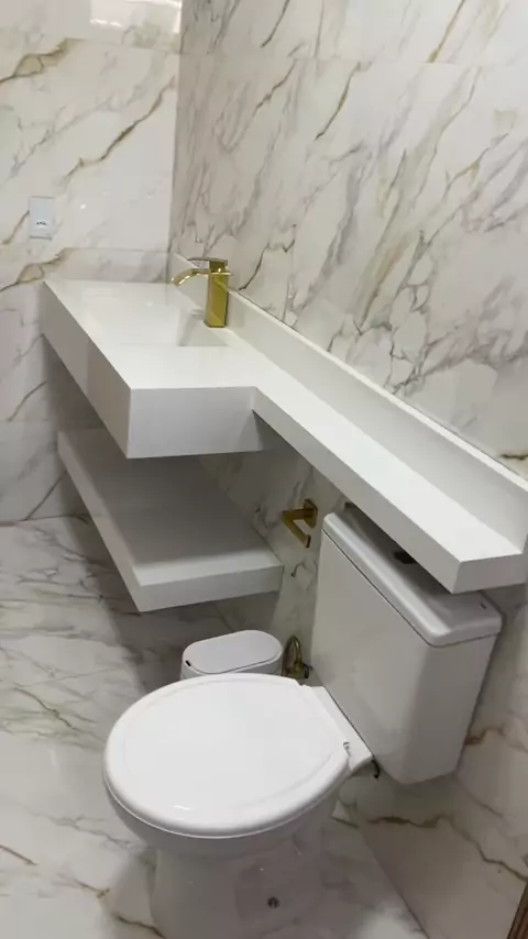 Olha que luxo esse banheiro no porcelanato com bancada de porcelanato e pia de porcelanato