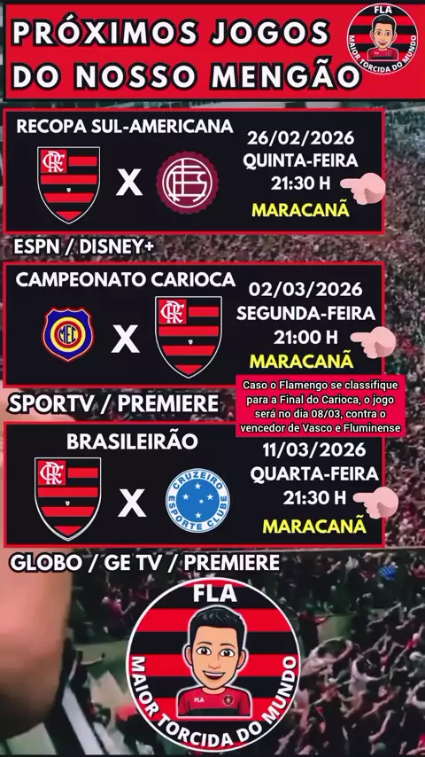 Estes são os próximos jogos do Flamengo .  * Flamengo X Internacional , Quarta-feira , dia 13 de Agosto , às 21:30 h , no Maracanã (pela LIBERTADORES). • Internacional X Flamengo , Domingo , dia 17 de Agosto , às 18:30 h , no Beira-Rio (pelo BRASILEIRÃO). • Internacional X Flamengo , Quarta-feira , dia 20 de Agosto  , às 21:30 h , no Beira-Rio (pela LIBERTADORES). #PrezãoKwaiTáNaSua #FLAMENGO #flamengoxinternacional #internacionalxflamengo #Futebol