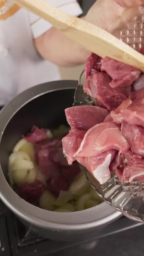 Caldo cremoso de mandioquinha com carne e linguiça Ingredientes: • 30 ml de azeite • 7 dentes de alho picados • 3 cebolas médias picadas • 800 g de patinho (ou carne de sua preferência) em cubos • 1 gomo de linguiça portuguesa em rodelas • 4 tomates picados • 1,5 kg de mandioquinha cozida e batida no liquidificador • 1 colher (sopa) de sal de ouro • 1 colher (sopa) de sal comum • Temperos a gosto: chimichurri, páprica, orégano, pimenta-do-reino Modo de preparo: Em uma panela grande, aqueça