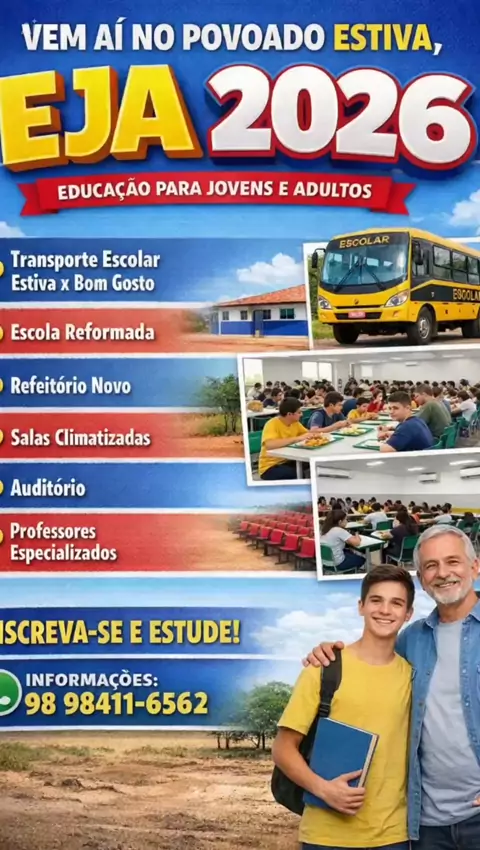 📚 *EJA 2026 – Povoado Estiva - TUTÓIA* Estão abertas as informações para jovens e adultos que desejam voltar a estudar! ✔ Transporte Estiva x Bom Gosto ✔ Escola reformada ✔ Refeitório novo ✔ Salas climatizadas ✔ Auditório ✔ Professores especializados 📞 *Contato*: 98 98411-6562 Garanta sua vaga e invista no seu futuro!