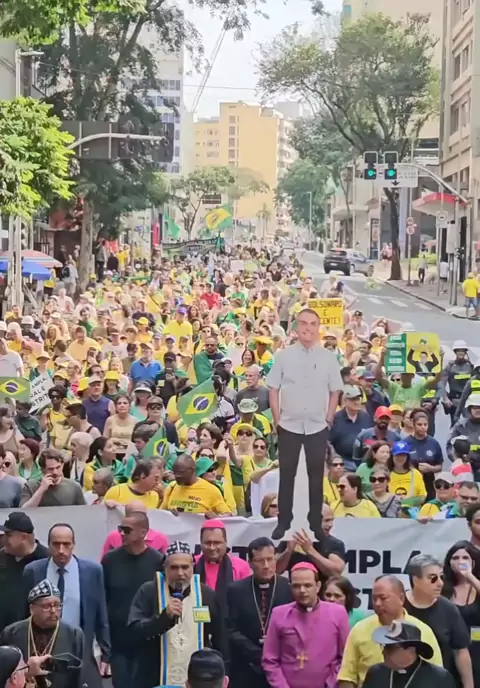 Caminhada pela Anistia reúne apoiadores de Bolsonaro em São Paulo Padre Kelmon promoveu, na manhã de ontem, a Caminhada pela Anistia, Liberdade e Paz em São Paulo. O ato teve início em frente ao prédio da TV Gazeta, na Avenida Paulista, e seguiu até a região da Praça da Sé, no Centro. Durante a caminhada, chamou atenção a utilização, pela primeira vez, de uma foto em tamanho real de Jair Bolsonaro, carregada por manifestantes ao longo do trajeto.