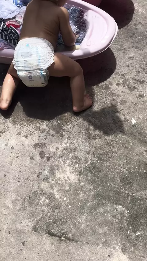 Sarah entrando na bacia de roupa.#trigemeos #maedetrigemeos