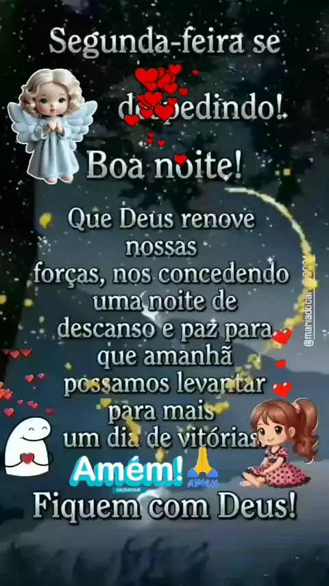 Boa noite! segunda feira se despedindo, que Deus renove nossas forças, nós concedendo uma noite de descanso e paz, para que amanhã possamos levantar para mais um dia de vitória 🙏 fiquem com Deus 🙏💙 bjs 💋💋💋💋💋