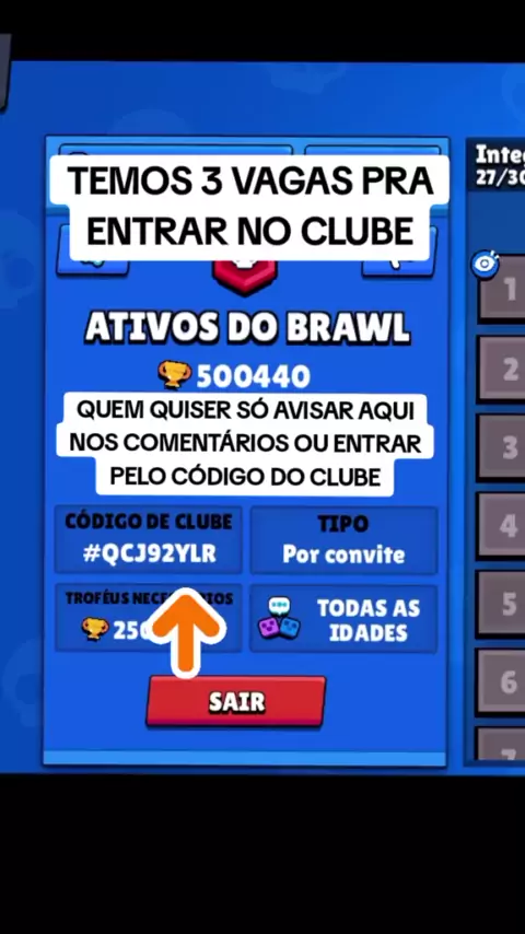 CÓDIGO DO CLUBE #QCJ92YLR TEMOS 3 VAGAS PRA QUEM QUISER ENTRAR 💥 #brawlstars #BrawlStar #brawlstarsgame #brawlstarbr