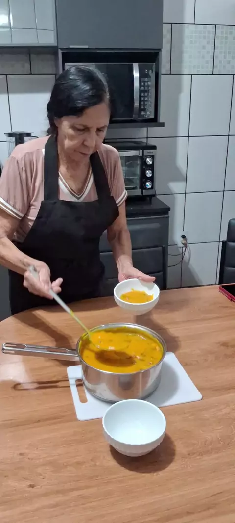 Caldo de abobora canbuthia com calabresa #Receita 1,2 kilo de sbobora canbuthia 1 colher de alho amassado 1 colher rasa de sal 1 colher de café de pimenta do reino 1cebola pequena picada Cheiro verde a gosto 1 gomo de linguiça calabresa 150 grs de bacon 2 colheres de óleo 1 para fritar o bacon 1 para dourar alho para cozinhar abóbora
