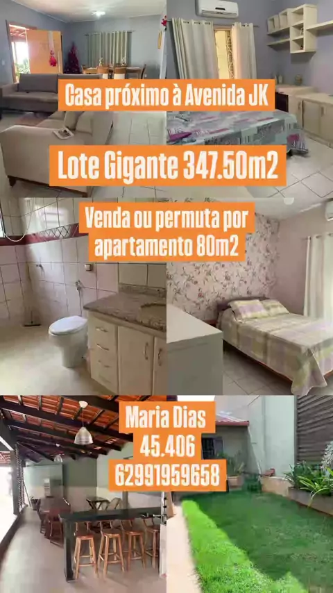 🚨Vendo ou troco Casa Proximo a Av JK por Apartamento de 80m2 em Torre única! 🚨Casa de esquina ✔️4/4 1 suíte ✔️3 banheiros ✔️Área gourmet ✔️Garagem para 3 carros ✅Terreno 347.50m2 ✅Construção 145.17m2 😍Casa Linda e muito arejada Fale comigo para agendarmos uma visita😉 Maria Dias CRECI 45.406