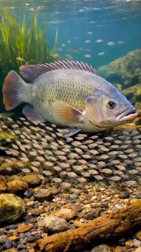 Uma corajosa tilápia adulta defende sua posição contra peixes-cabeça-de-cobra e bagres para manter sua prole segura. Na natureza, coragem e instinto são essenciais para garantir a sobrevivência da próxima geração diante das ameaças dos predadores.🐟🐠 #🌍Naturezashow #peixes