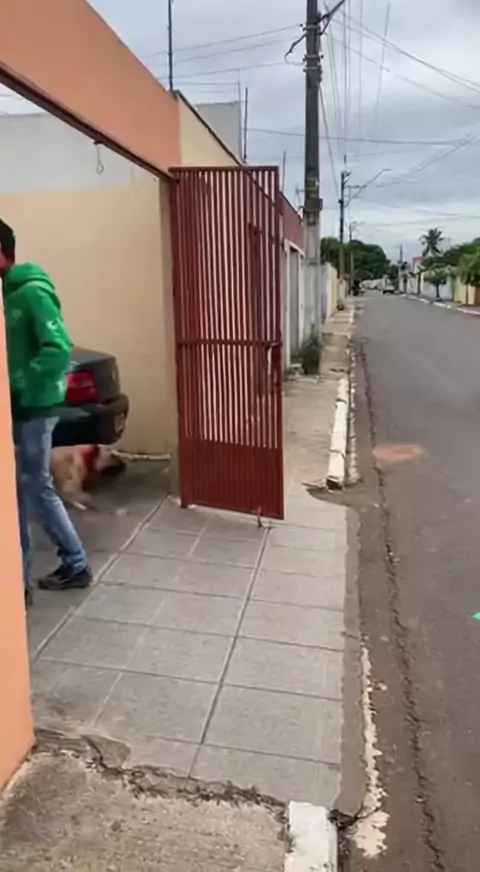 O entregador deixou o portão aberto e o cachorro fugiu! Derrubou um motoqueiro na rua... De quem é a culpa? 🐕🏍️ #Delivery #Cachorro #Fail #Acidente #Prejuizo"