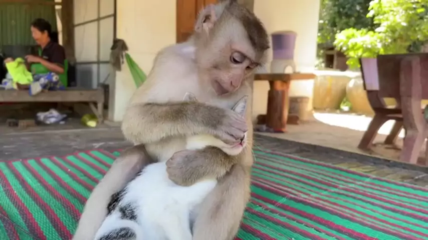 O mano macaco no Vietnã veio com seu gatinho novamente. o macaco arranhou bem e o gato gostou. # Brother Monkey