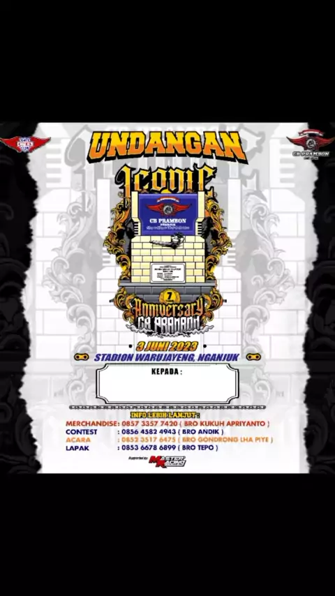 Bismillahirrahmanirrahim.. CB PRAMBON NGANJUK Mengundang bikers CB Se-NUSANTARA dalam event ICONIC Anniversary CB PRAMBON yg ke 7 Besok InsyaAllah tgl 03 JUNI 2023 di stadion WARUJAYENG - NGANJUK Nganjuk MenungguMu dulurrr...🙌#cbprambon#cbprambonnganjuk#cbnganjukbersatu#cbnganjukantitobat#iconiccbprambon