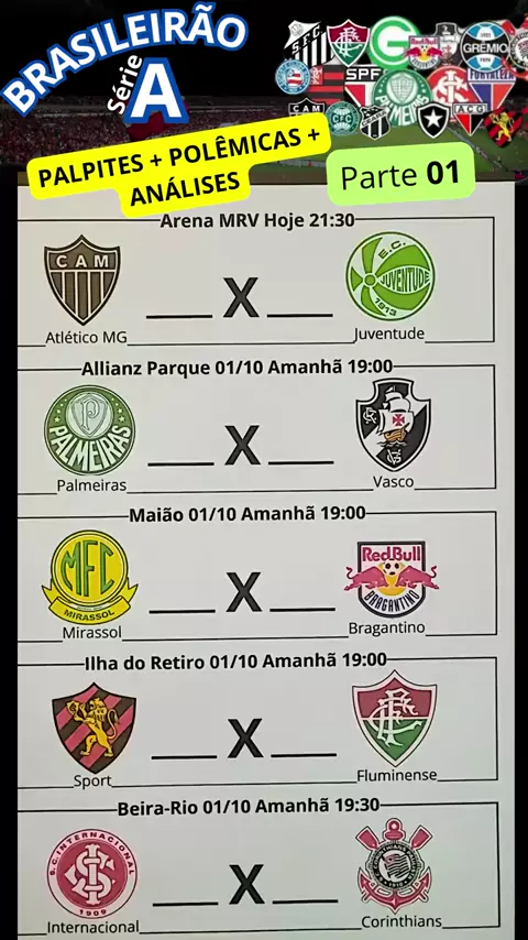 Jogos Brasileirão Seria A do dia 30/09 e 01/10 2025 / Parte 01 PALPITES 26ª RODADA Atlético MG x Juventude - Arena MRV Hoje 21:30 Palmeiras x Vasco - Allianz Parque 01/10 Amanhã 19:00 Mirassol x Bragantino - Maião 01/10 Amanhã 19:00 Sport x Fluminense - Ilha do Retiro 01/10 Amanhã 19:00 Internacional x Corinthians - Beira-Rio 01/10 Amanhã 19:30#futebol#sports#formou#futebolbrasileiro