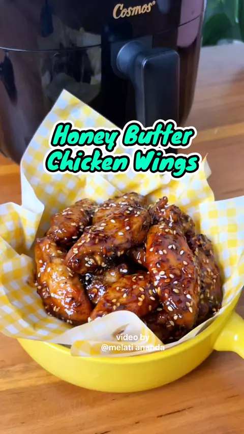 Bingung kalo masak chicken wings gitu gitu aja. Cobain resep ini deh simple dan enak banget. Saos nya berasa ada pedas manis, ada crunchy jadi satu. Masak ayamnya pakai Air fryer Cosmos Vanilia CAF 6600. Hasilnya matang merata, garing di luar, lembut di dalam. Honey butter chicken wings Bahan marinasi : 500 gr sayap ayam Dry rub Bahan saus : 2 sdm butter 2 siung bawang putih cincang 1 sdm brown sugar 1 sdm kecap manis 2 sdm saus sambal 1 sdt cabai bubuk 1 sdt cuka 1 sdm madu 1 sdm wijen
