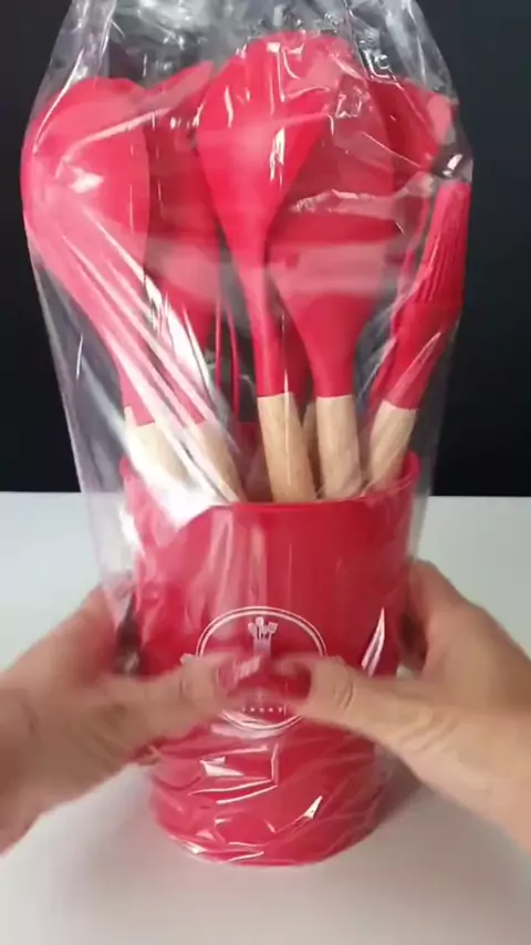 Jogo de Cozinha Kit c/ 12 Peças de Silicone, Utensílios e Copo Suporte para Cozinha Cabo de madeira #utencilioscasa #jogodecozinha #ofertaskwai #kwaishop #cozinharosa