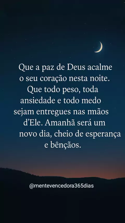 Boa noite! Que seu descanso seja leve, sua mente tranquila e seu coração cheio de fé. Entregue tudo a Deus e confie: Ele está cuidando de cada detalhe. #BoaNoiteComDeus #MenteVencedora365Dias #FéQueAcalma #DescansoDaAlma #PazInterior