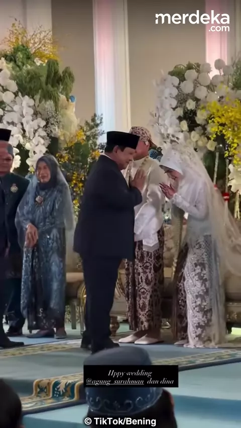 Presiden Prabowo Subianto menghadiri pernikahan sekretaris pribadinya, Agung Surahman, Minggu (18/1). Kehadiran Presiden Prabowo bersamaan dengan kehadiran Joko Widodo. Terlihat Presiden Prabowo memberikan selamat dan menepuk jidat Agung. Jokowi dan Prabowo juga berfoto bersama dengan pengantin.