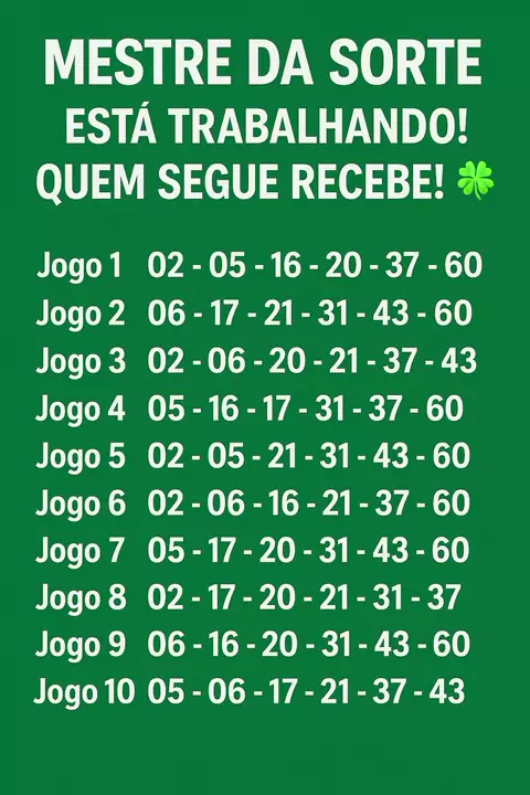 🎟️ Simulação criada por IA 🍀 Quina do dia! Quem teria coragem de apostar nesses números? 💬 Comenta seu palpite e marca aquele amigo que precisa de sorte! ✨ Curte, compartilha e segue para mais simulações do Mestre da Sorte!🎟️ Simulação criada por IA 🍀 Quina do dia! Quem teria coragem de apostar nesses números? 💬 Comenta seu palpite e marca aquele amigo que precisa de sorte! ✨ Curte, compartilha e segue para mais simulações do Mestre da Sorte!🎟️ Simulação criada por IA 🍀 Quina do dia! Que