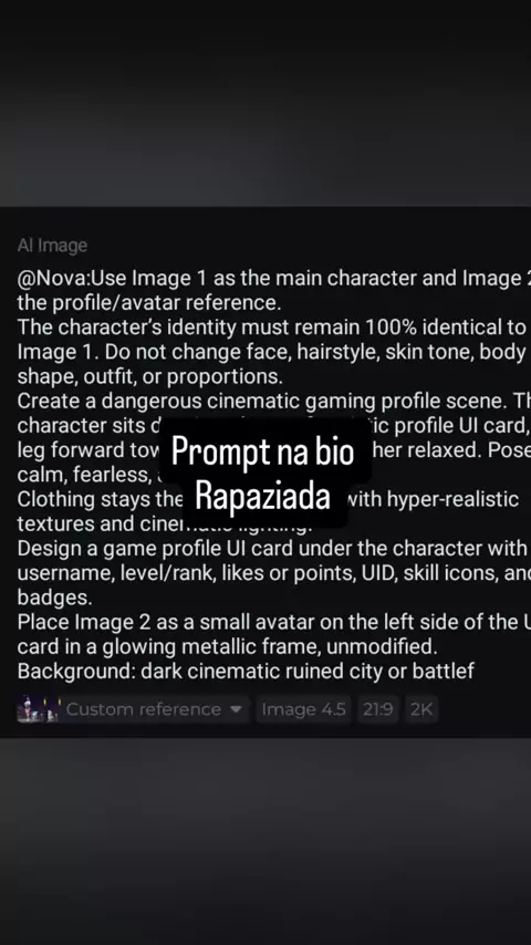 Use a Imagem 1 como personagem principal e a Imagem 2 como referência de perfil/avatar. A identidade do personagem deve permanecer 100% idêntica à da Imagem 1. Não mude rosto, cabelo, tom de pele, formato do corpo, roupa ou proporções. Crie uma cena cinematográfica perigosa de perfil gamer. O personagem fica sentado de forma dominante em um card futurista de perfil, com uma perna à frente em direção à câmera e a outra relaxada. A pose deve ser calma, sem medo e com postura de chefe. #freefire