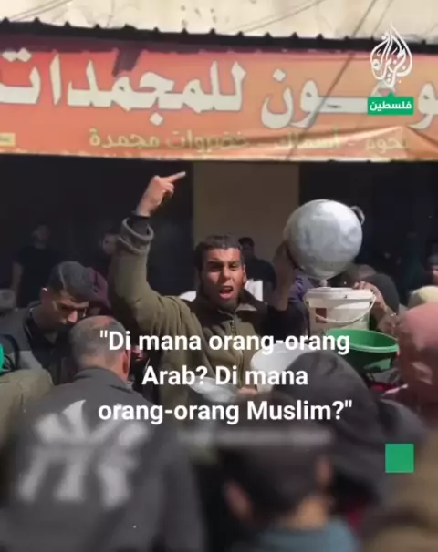 Seorang pemuda berteriak di tengah kerumunan warga Palestina yang mencari makanan di Jalur Gaza utara. #palestine♥ #fyp #viral #trending #gaza