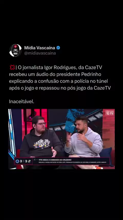 💢| Mais detalhes do absurdo O presidente Pedrinho explicou por áudio tudo que aconteceu durante a cobrança à arbitragem e a ação truculenta da polícia. O jornalista Igor Rodrigues reproduziu o que Pedrinho falou. Inaceitável. É inaceitável o presidente da instituição ser tratado dessa forma após uma cobrança JUSTA. ⚫️ Siga a Mídia Vascaína e viva o Vasco com a gente #Vasco #MídiaVascaína