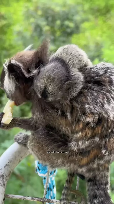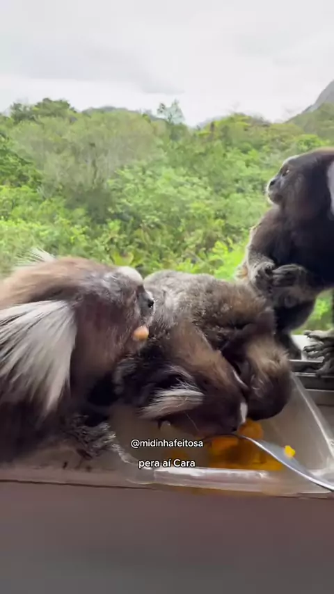 Os saguis deixaram cair o pote de manga no chão. Minhas visitas pedindo comida na janela. #saguis #alimento #vida