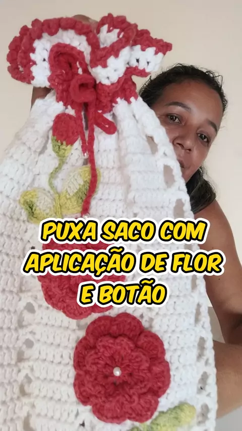 puxa saco com aplicação de flor e botão #bora crochetar lindezas