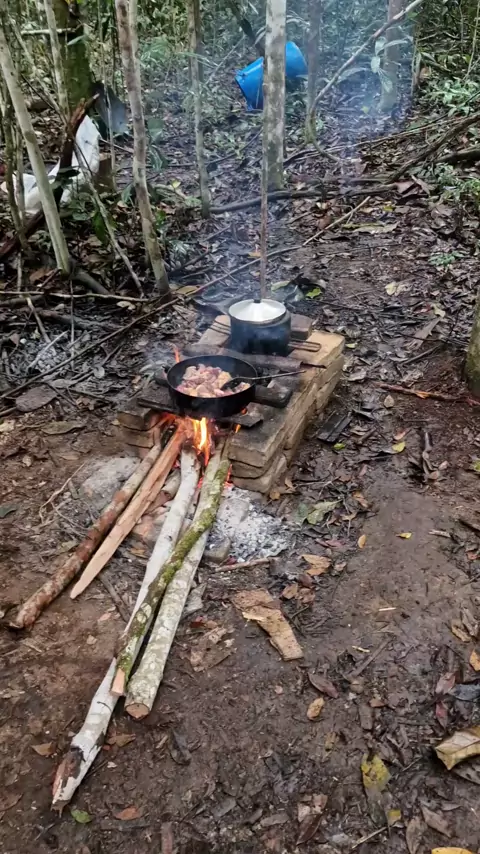 Atividades e fartura do acampamento na mata