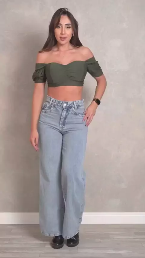 Calça Jeans Wide Leg Marmorizada disponível no link abaixo. #looks #viraliza #kwaishop #elegancia