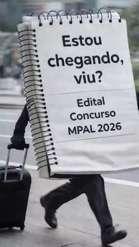 👀👂📚 Ele ainda não chegou oficialmente… mas já estamos escutando seus sinas. 😜 O edital do concurso do MPAL está batendo à porta. E quem está na preparação sabe: quando ele avisa que vem chegando, é hora de afinar os estudos, revisar o foco e manter a disciplina. Descrição da imagem: Uma pessoa caminha por uma calçada urbana puxando uma mala de rodinhas. No lugar do corpo, há um grande caderno em espiral, como se fosse uma placa. No caderno, em letras pretas, está escrito: “Estou chegando...