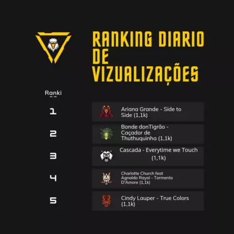 Ranking de Vizualizações. Dia: 19/04/2024 Entrada da Ariana Grande no Ranking e deve ficar ai por um bom tempo (ainda bem que ela tem bastante musica) #ArianaGrande #Bondedotigrao #Cascada #CharlotteChurch #cindylauper