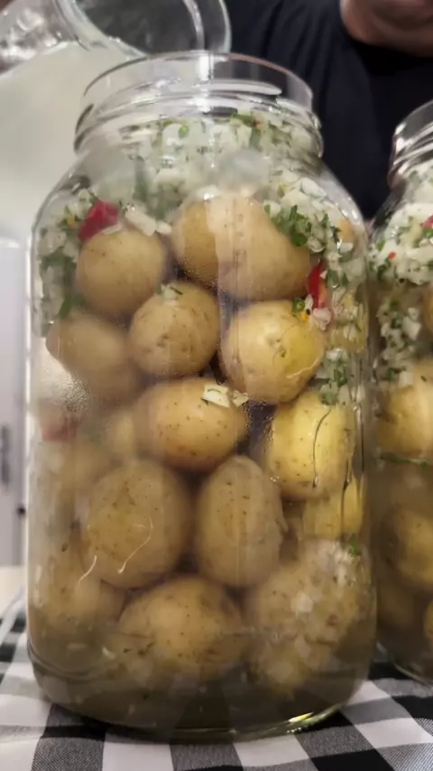 3,5 quilos de batata bolinha 1,5 litro de vinagre de álcool 700 ml de água 2 cebolas picadas 5 dentes de alho 400 ml de azeite (200ml para cada pote) 2 limões 1 pimenta dedo de moça com semente 1 maço de cheiro verde 1 colher de sopa rasa de pimenta calabresa 1 colher de chá de pimenta do reino Aproximadamente 5 colheres de sopa de sal (use 1 colher no cozimento das batatas e 4 colheres na salmoura) Os potes que usei são de 5 litros cada (são potes grandes de palmito) #batata #conserva