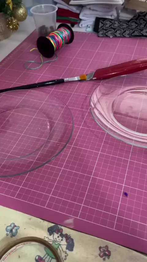 Prato Decorado de Natal 🎄🎅🏻🧑🏻‍🎄⛄️ - um prato transparente - cola branca de artesanato - verniz - pincel - rolinho de pintura - tecido (melhor é tecido de algodão) Passo a Passo Cortar tecido um pouco maior que o tamanho do prato. Passar cola com o pincel e espalhar com o rolinho, em seguida colocar o tecido por cima da cola e esticar com as mãos. Deixar secar bem. Depois de estar bem seco pode passar com camada de cola por cima do tecido e deixar secar novamente. Depois de seco é só pas