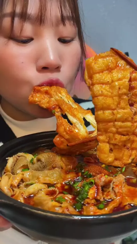 Siapkan semangkuk makanan rumahan yang direbus dengan irisan daging babi dalam minyak cabe panas.