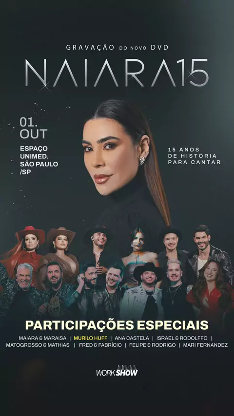 Falta uma semana para o DVD e, a cada dia que passa, as emoções ficam ainda mais à flor da pele. O orgulho de tudo o que venho construindo e dos passos que tenho dado me enche de felicidade. E quando digo isso, não é da boca pra fora, estou vivendo o momento mais feliz da minha carreira. Só tenho a agradecer aos amigos que a música me deu por terem topado estar comigo nesse dia tão especial e importante. Tá chegando, Naiara 15 ✨ 📆01/10/25 📍@espacounimed 🎫 @ticket360
