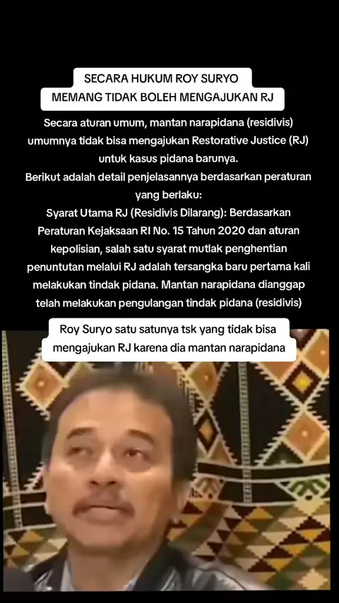 Di kasus ini Roy Suryo satu satunya tersangka yang tidak bisa mengajukan RJ karena dia mantan narapidana. Ada undang undang nya yaitu Peraturan Kejaksaan RI No 15 tahun 2020. selesai lu roy 🤣🤣🤣🤣#jokowi#roysuryo#rismon#indonesia#