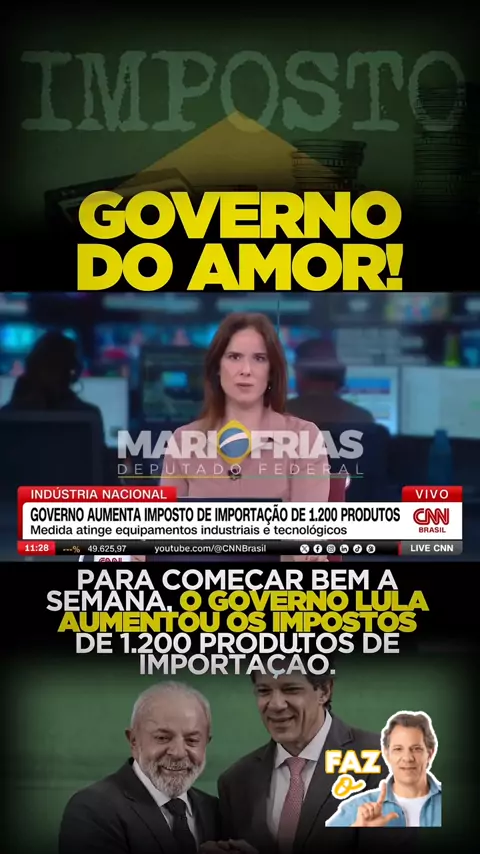 POLÍTICA / FAZ O L Governo Lula aumenta impostos de mil produtos para cobrir rombo de R$ 14 bilhões Medida atinge itens de tecnologia, bens de consumo e maquinário industrial com alíquotas de até 25%. #Eleições @Flávio Bolsonaro(O150001120824955) @Carlos Bolsonaro(O150001291776451) @Abilio Brunini(O150001194326795) @Jairbolsonaro(O150001291768715)