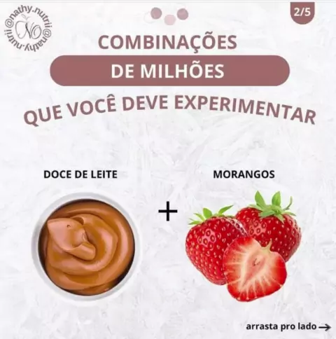 Combinações de milhões que você deve experimentar. Trouxe 5 opções sendo: 1. Brigadeiro de paçoca. 2. Doce de leite com morangos 3. Chocolate com morango 4. Mingau de aveia com biscoito Oreo triturado. 5. Uva com leite condensado. Pra realmente matar aquela vontade de doce. Obs: É importante ajustar as quantidades certinho. Espero que você tenha gostado. Já salva para consultar sempre que precisar. Eee me conta, já experimentou alguma dessas opções?? Tem alguma opção que não inclui no post