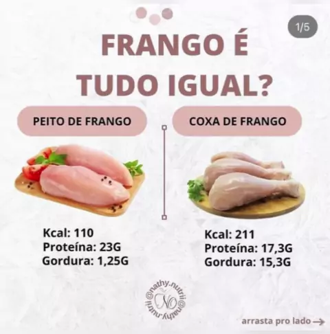 Cada corte de proteína tem sua particularidade! Mudam suas quantidades calóricas de gordura e proteína. Saiba adequar aquele que melhor se enquadra no seu plano alimentar e obietivo! Os valores equivalem a 100g dos alimentos crus. Espero que esse post te ajude de alguma forma. Salvem o post e mandem para os amigos!