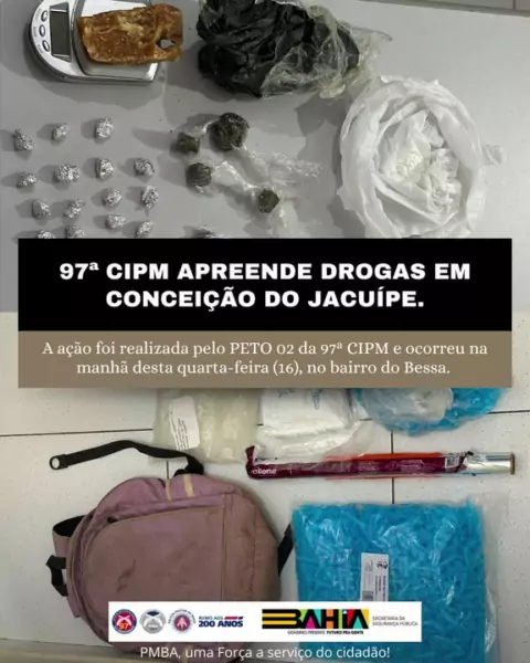 Na manhã desta quarta-feira, 16, a guarnição do PETO 02 da 97ª CIPM, *durante rondas no Buraco da Gia, avistou dois indivíduos que fugiram para um terreno baldio ao notar a presença policial.* Em buscas no local, foram encontrados uma mochila contendo 10 buchas de maconha, 19 pedras de crack, 5 pinos de cocaína, uma balança digital e outros materiais. O material foi encaminhado à Delegacia de *Conceição do Jacuípe* para as devidas providências. PMBA, uma Força a serviço do cidadão! Assessoria