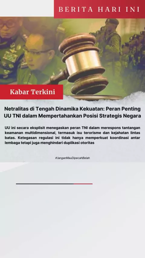 UU TNI menegaskan pentingnya peran TNI dalam menjaga keamanan dan memperkuat posisi strategis negara. Ini adalah langkah penting untuk menjaga kedamaian dan kestabilan nasional #UUTNI
