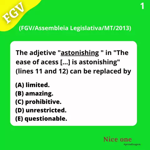 " Flashcards " em inglês para banca FGV. Estudando para concursos públicos? Aqui você encontra um conteúdo para acelerar sua aprovação, além de ser de rápida revisão e memorização. Através desses" flashcards ", você terá domínio do padrão das provas da banca FGV. Descobrirá como o examinador realmente pensa. Dica: Primeiro tente resolver sozinho a questão, depois veja a resposta.